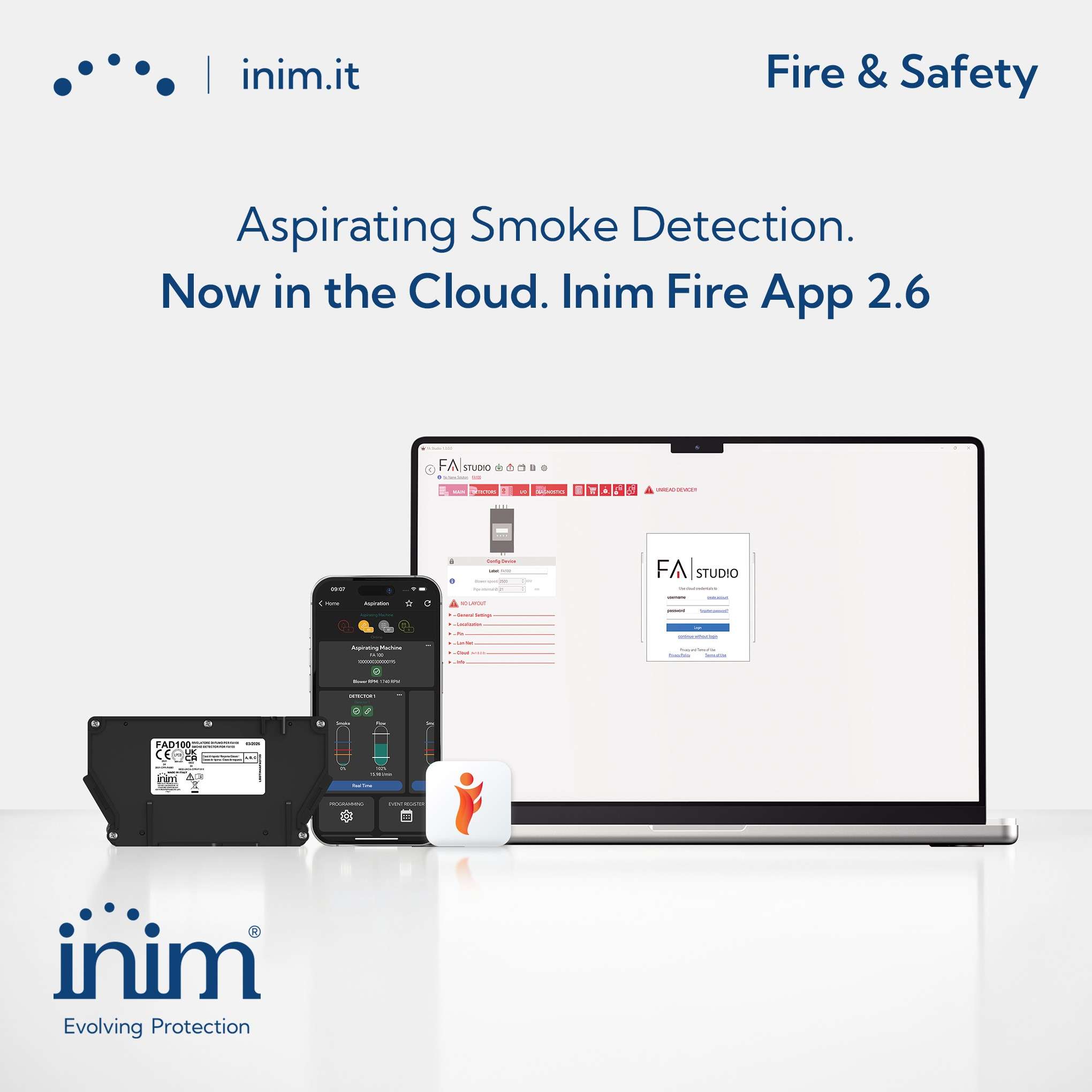 Az Inim Fire App 2.6-os verziójával az FA100 aspirációs érzékelő már teljes mértékben elérhető LAN vagy WIFI modulok segítségével az ingyenes Inim Cloud Fire felületén. A készülék önálló elemként jelenik meg az alkalmazásban, és QR-kód segítségével pillanatok alatt regisztrálható. Ezzel azonnali hozzáférést kap az aspirációs rendszerekre optimalizált, dedikált kezelőfelülethez, ahol a távvezérlés és a folyamatos felügyelet garantálja az eszközök feletti teljes kontrollt.