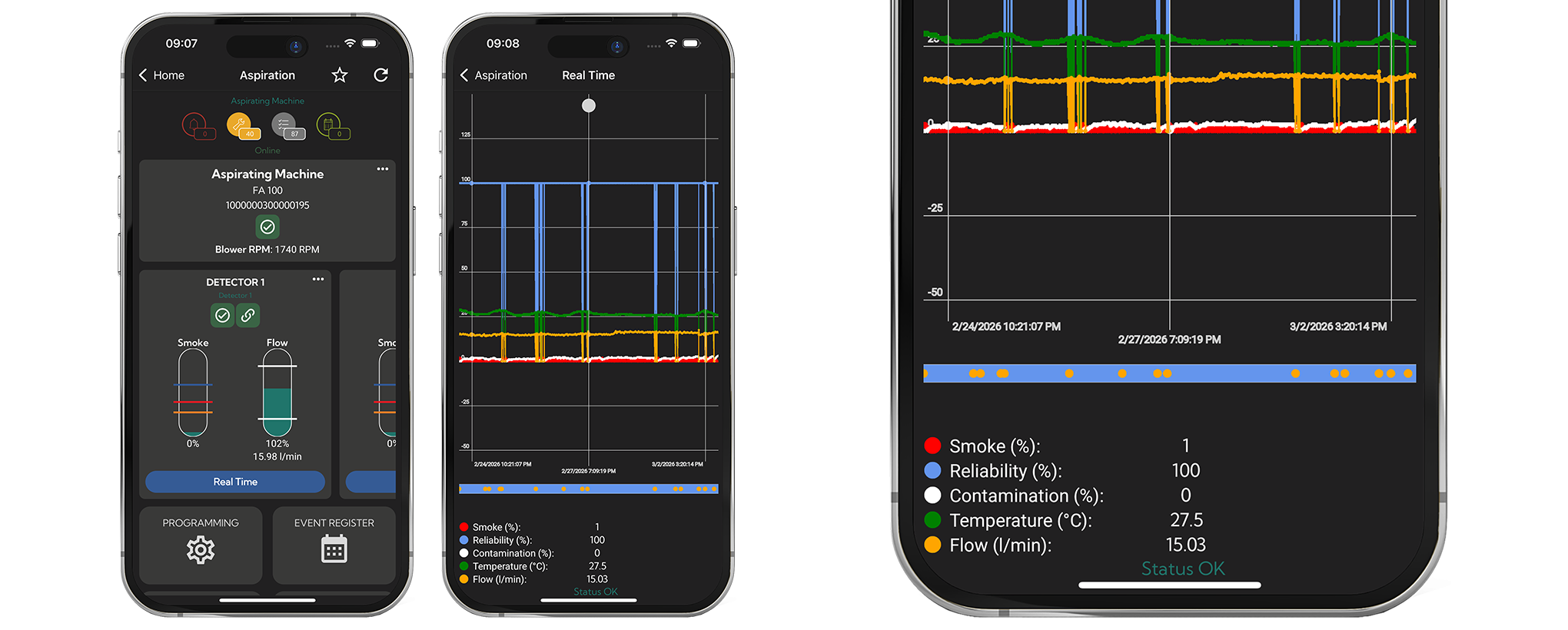 Az alkalmazás dedikált irányítópultja azonnali áttekintést nyújt a rendszer általános állapotáról, beleértve a kapcsolat állapotát, a legfontosabb paramétereket és az eszközök működési feltételeit. Minden érzékelő valós időben felügyelt, a füst- és áramlási értékek folyamatosan frissülnek. Az "Érzékelő adatnapló" szekciónak köszönhetően lehetőség nyílik a korábbi mérési adatok megtekintésére és a paraméterek időbeli alakulásának elemzésére is.