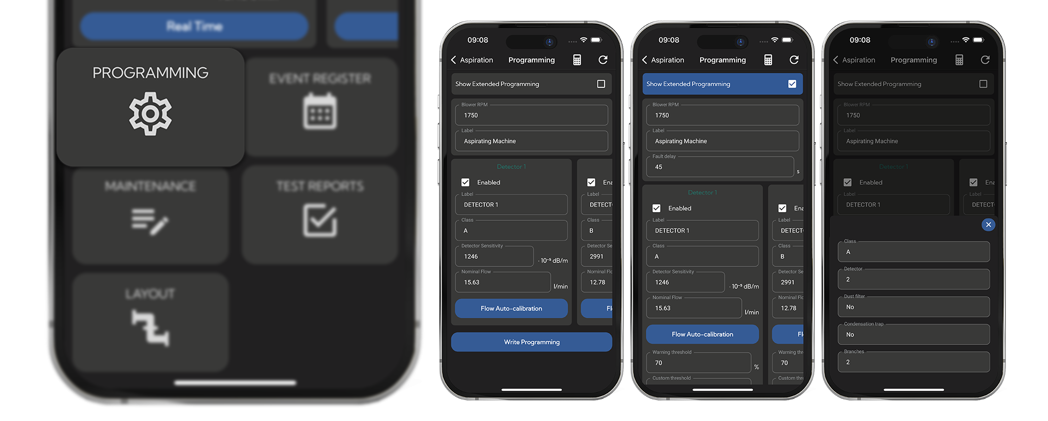 Az új „Programozás” menüpont lehetővé teszi az első szintű beállítások elérését közvetlenül az alkalmazásból. Beállíthatók az olyan főbb paraméterek, mint a ventilátor sebessége, az eszközök címkéi és a késleltetési idők, valamint az egyes érzékelők érzékenysége és küszöbértékei. A „Légáramlás automatikus kalibrálása” funkció a rendszer automatikus kalibrálását is támogatja, teljes mértékben távoli vezérléssel.