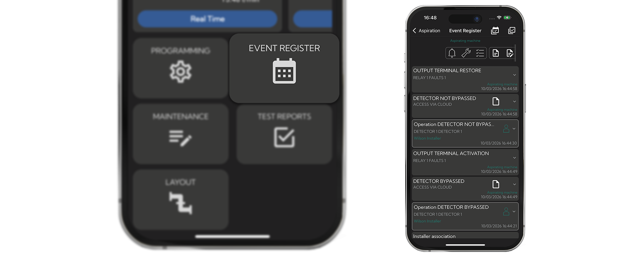 A "Rendszernapló" időrendben sorolja fel az összes eszközeseményt – beleértve a riasztásokat, a hibákat és a műveleteket. A „Tesztjelentések” szekció automatikusan elkészíti a szabványoknak megfelelő ellenőrzési és karbantartási jelentéseket, amelyek azonnal elérhetők a felhőben.