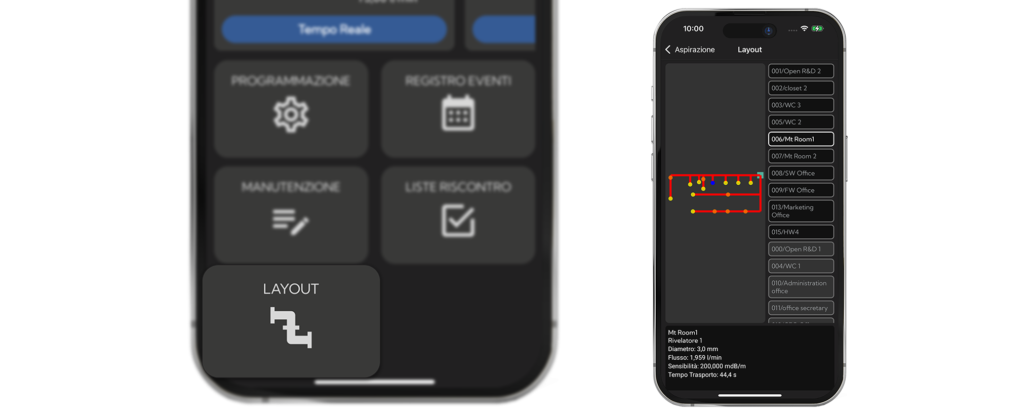 A „Csőhálózat elrendezés” szekcióban megtekinthető az FA/STUDIO szoftver által létrehozott 2D CAD alaprajz, a csőhálózat és a mintavételi pontok teljes körű böngészési lehetőségével. Ez a funkció mind a telepítési, mind a karbantartási munkálatokat támogatja.